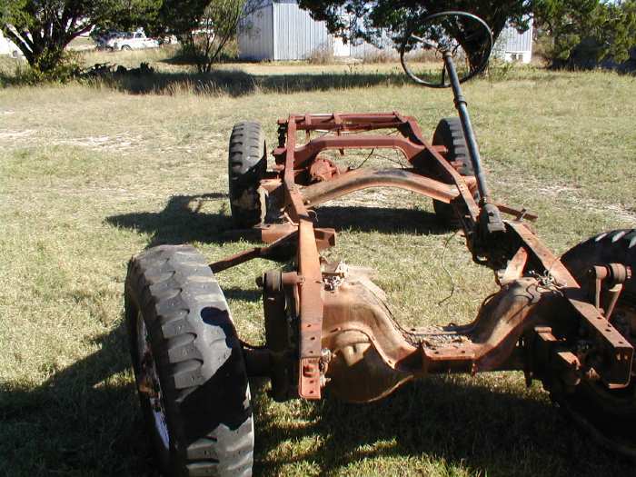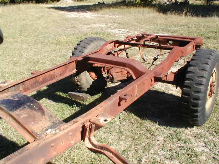 Here are some views of a very nice frame with the transfer case and driveshafts removed. It has light surface rust, but is very straight. There are no modifications, cuts, or welds. Most fender and running board brackets were removed except for two running board bracket hanging loosely on each side that were not completely removed when the photos were taken. Also, the master cylinder is lying on the right splash shield.