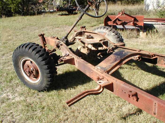 Above and below, the frame as viewed from the left. You can see some original black paint on the transfer case crossmember that was protected by the cab.