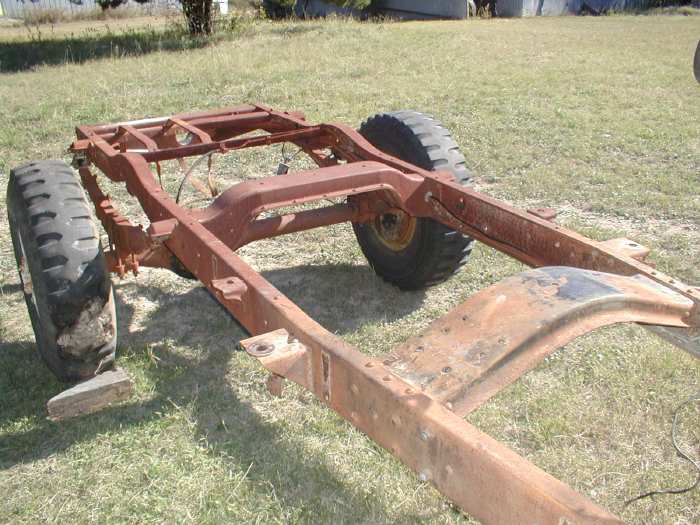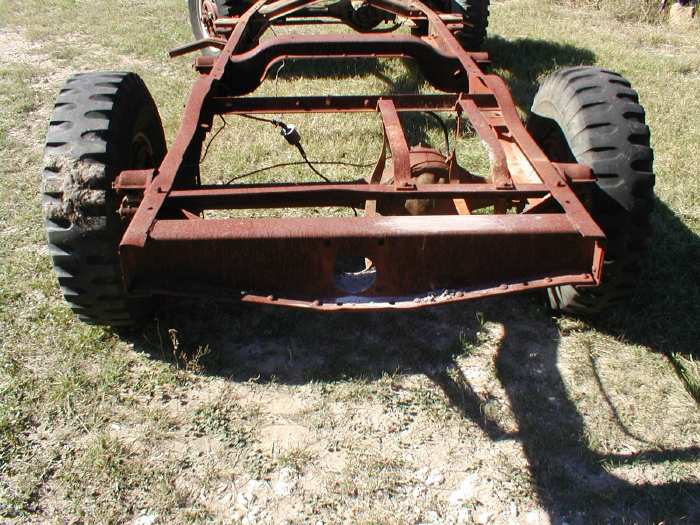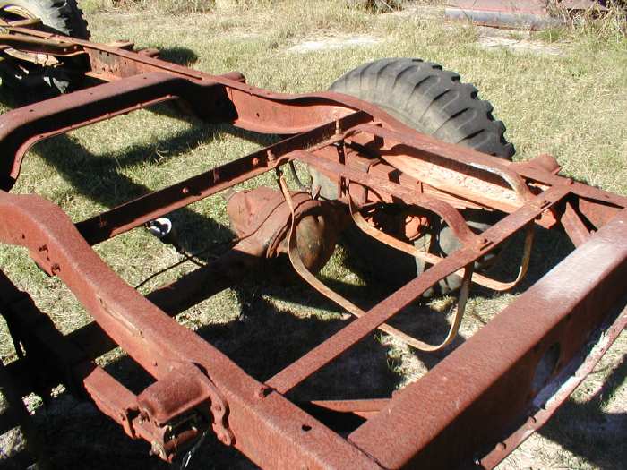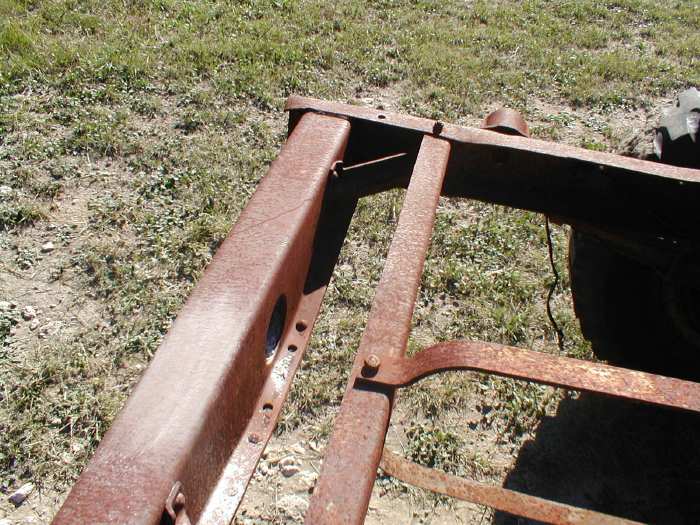 Above, a view of the crossmember that supports the frame at the front hangers for the rear springs. It is similar in construction to the rear crossmember in that it, too, is a "hat channel" design that is boxed by adding the riveted bottom piece. By the way, both these "boxed" crossmembers collect debris and are subject to rust through.